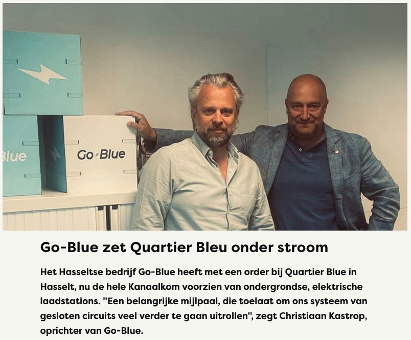 Na een proefproject in een kleinere residentie in Hasselt (Gaerveld), rolde Go-Blue het systeem uit rond de Hasseltse Kanaalkom, met projecten bij Zuidzicht (4 * 78 plaatsen), De Kaai (211 plaatsen) en nu ook Quartier Bleu. “Met deze nieuwe opdracht voor de residentiële parkings van Quartier Bleu zal Go-Blue de volledige uitrol van deze zone hebben uitgevoerd”, weet Kastrop. “Een belangrijke mijlpaal en mooie referentie. In die mate dat projectontwikkelaars vanuit heel België al zijn komen aankloppen met interesse voor ons systeem.” Go-Blue kiest daarbij voor een aanbod in totaalpakketten: “We staan in voor de productie, installatie, beheer van laadstations, alsook voor het leveren van laadpassen. (tekst door Kurt Meers)